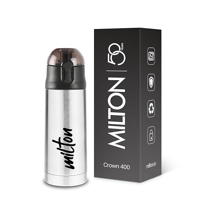 Milton New Crown 400 Thermosteel Water Bottle 350 ml with One Touch Safety Lock, 24 Hours Hot and Cold, Leak Proof Lid, ISI Certified I Vacuum Insulated I for Office, Gym, School I Silver