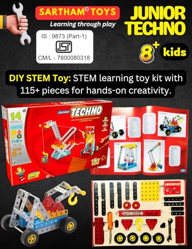 SARTHAM Junior Techno, 8 to 12 Years, DIY Educational kit, Engineering Tool kit Toy, 1 Set STEM Learning Metal Toy, Gift for 8+ Year Old boy and Girl, 115+ Pieces Puzzle and 14 Models | Multicolor